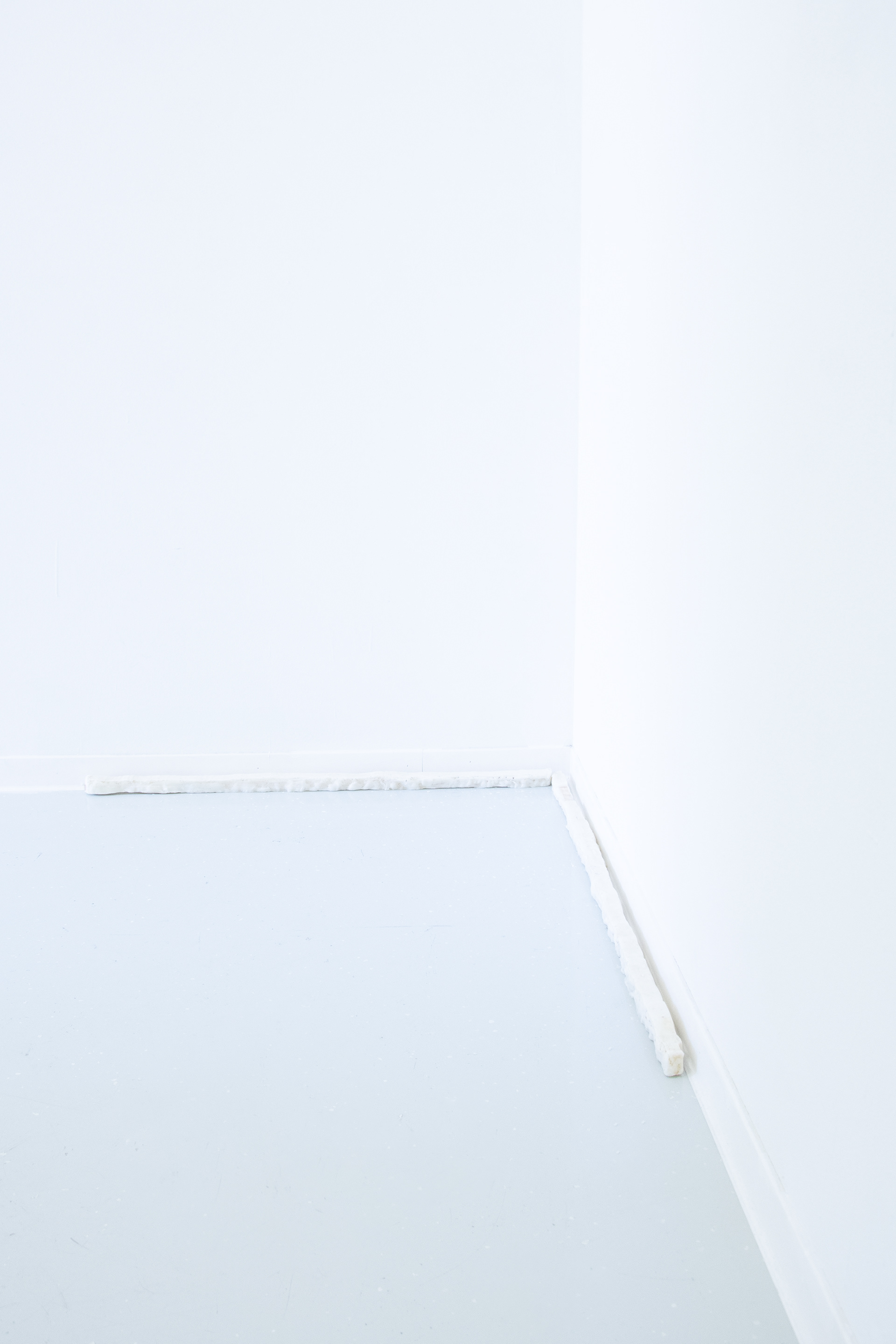 Strap lies on the floor, where a textile-like acrylic piece folds into a wax frame, evoking gestures of weaving and fastening. Frame 1 stands as a self-contained object suggestive of support, while Corners draws the room into the work by tracing wax lines along its edges, subtly breaking and connecting space.